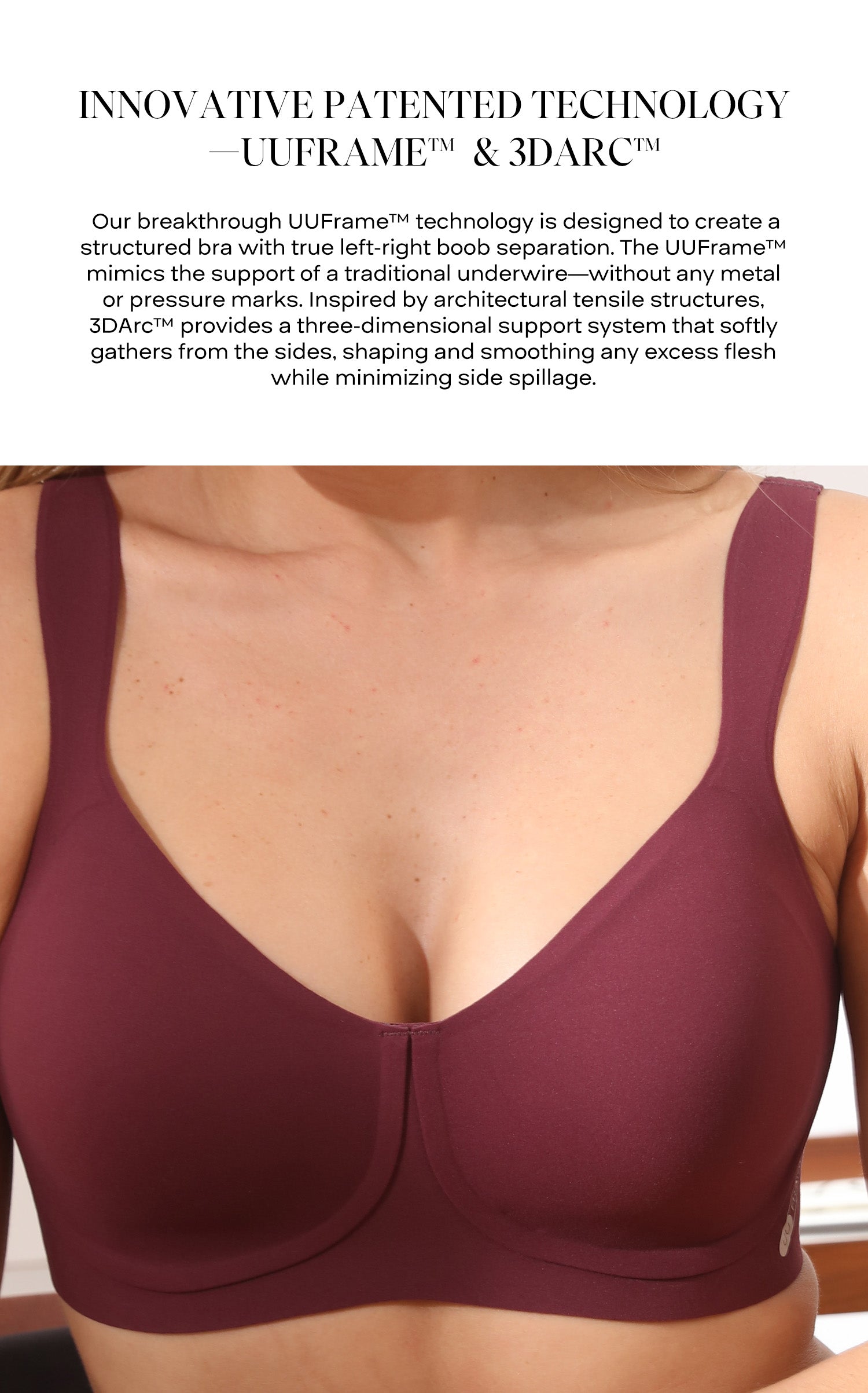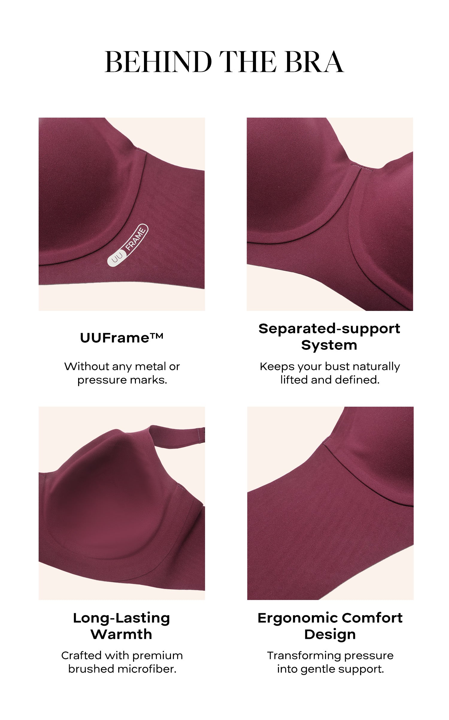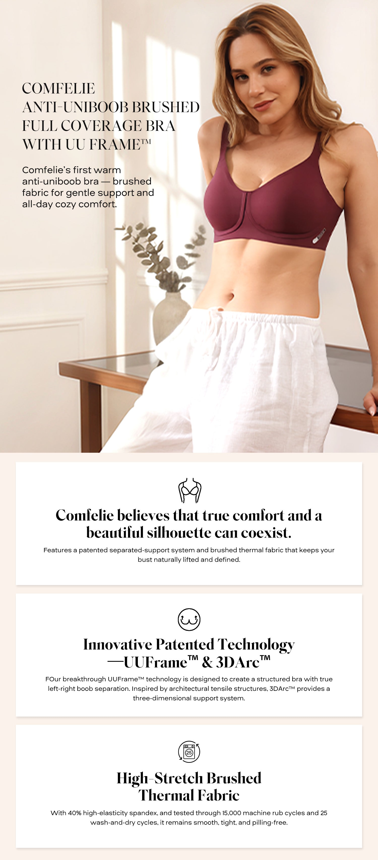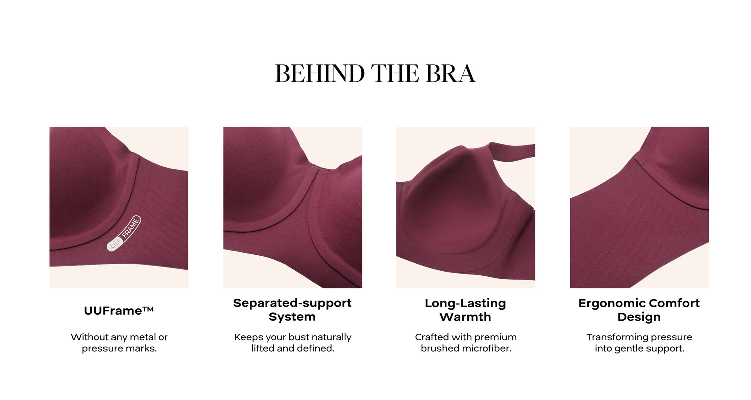 Comfelie’s first warm anti-uniboob bra — brushed fabric for gentle support and all-day cozy comfort.
