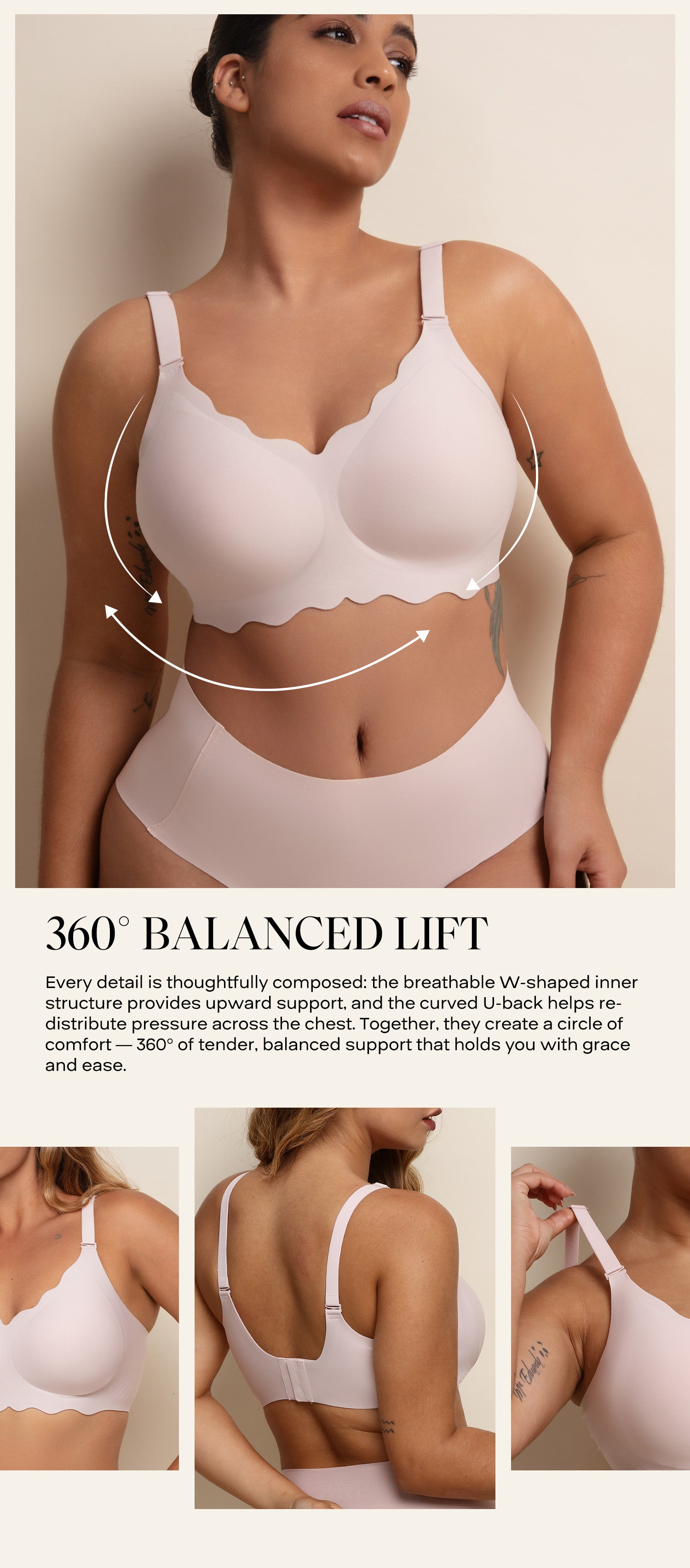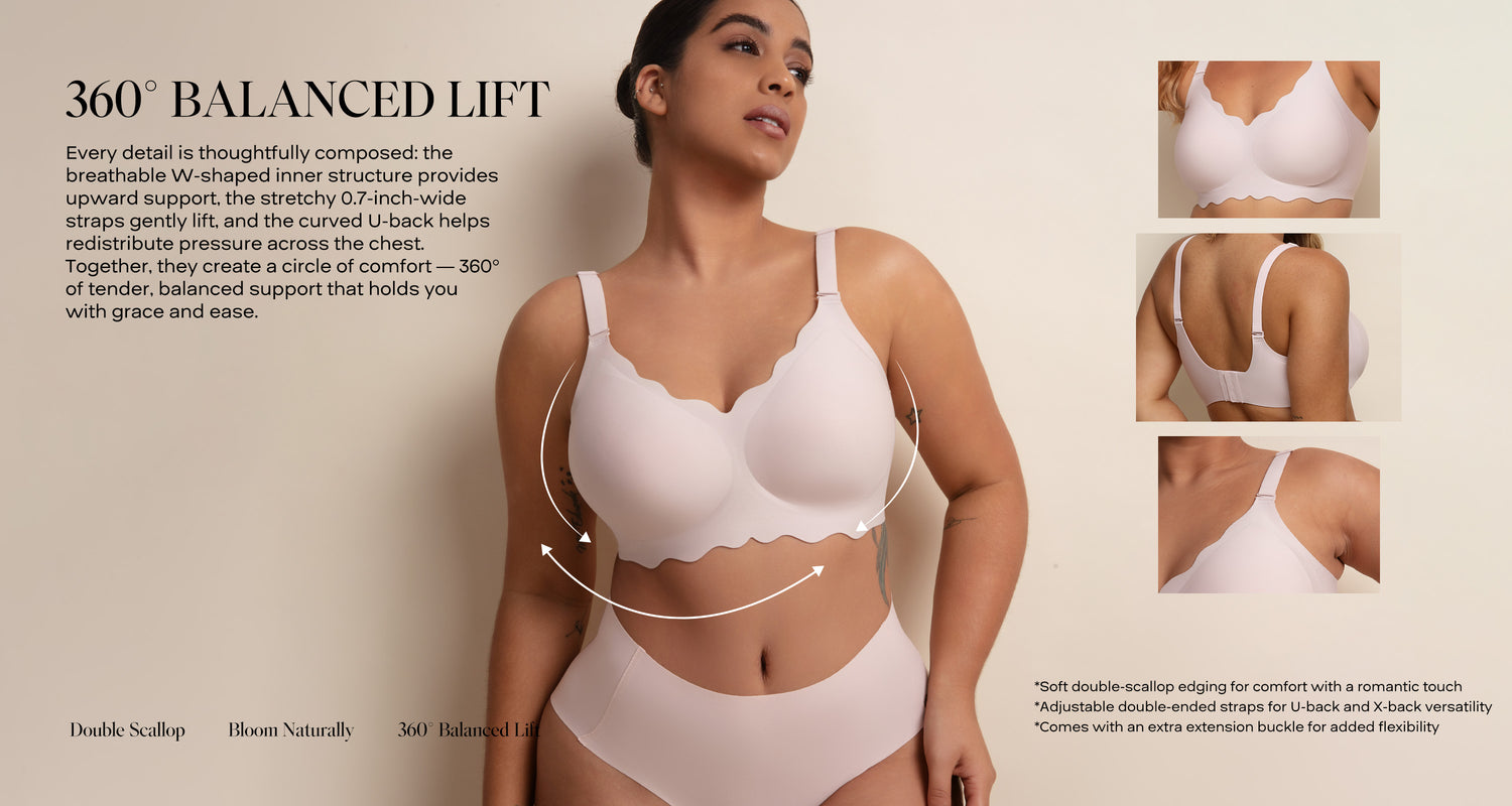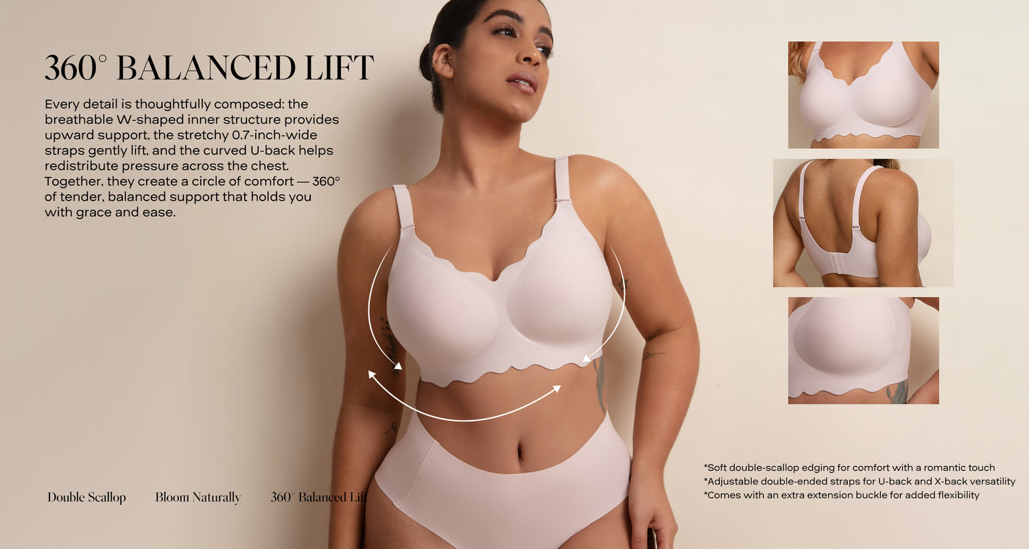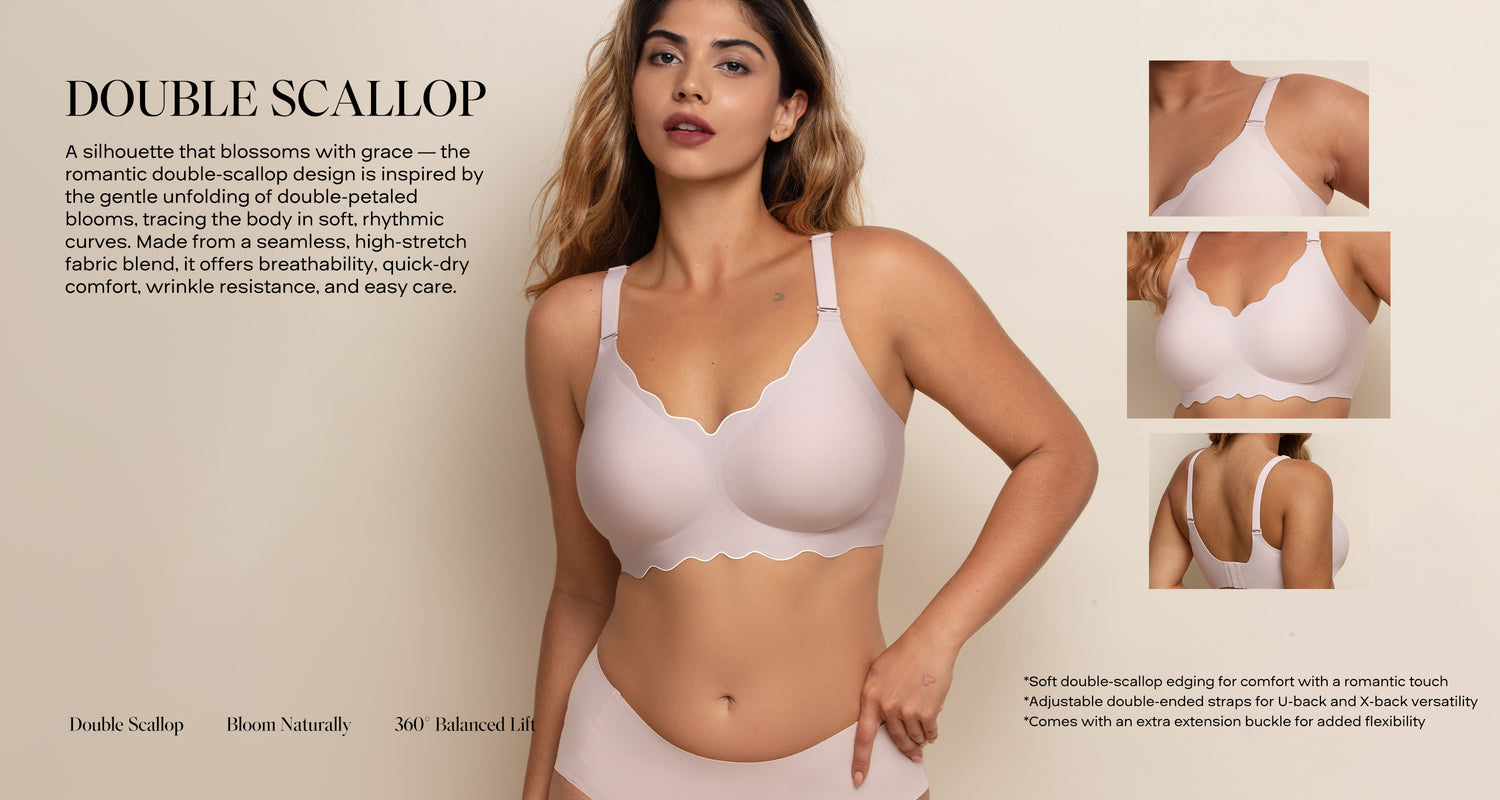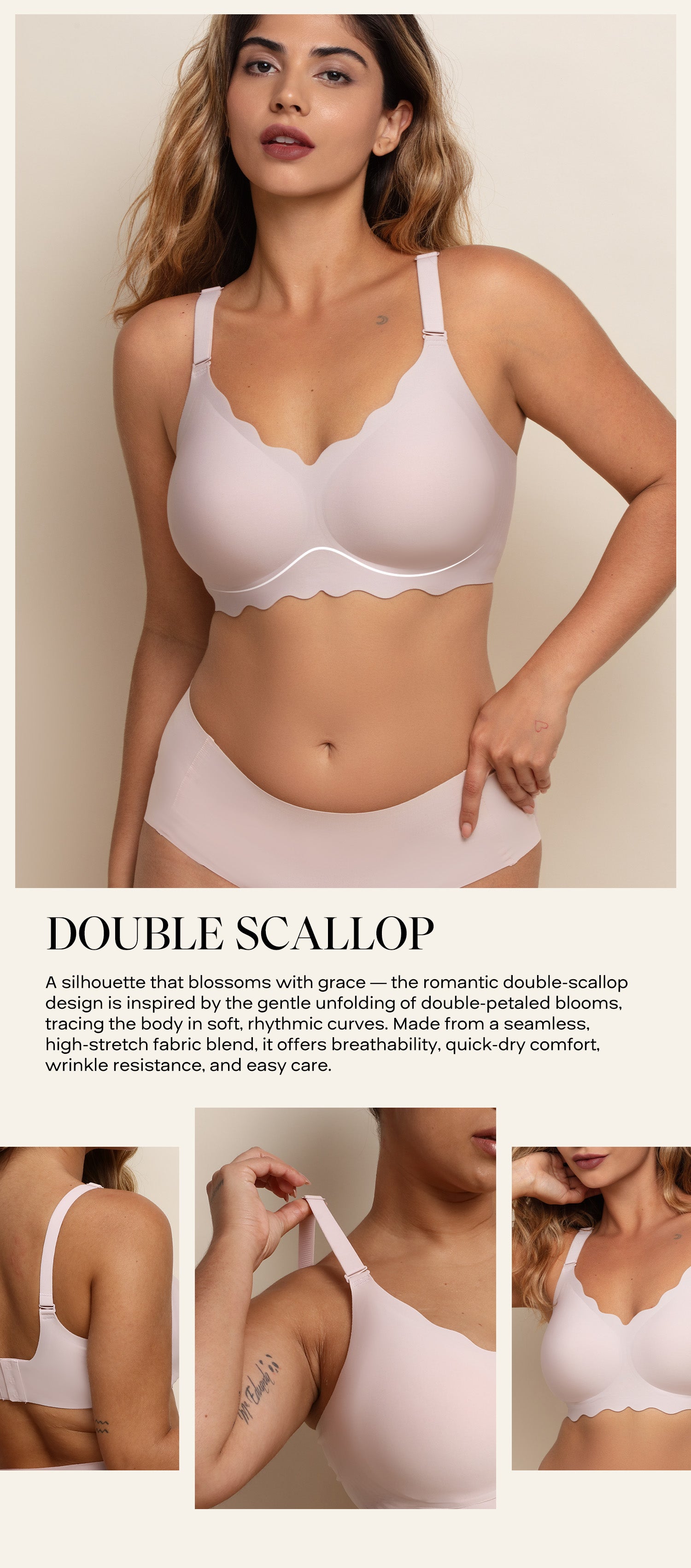 Featuring double-scalloped edges and a wire-free silhouette, it offers soft support with a refined touch. Crafted with breathable fabric and bonded details, it blends minimalist design with graceful femininity—perfect for everyday wear.