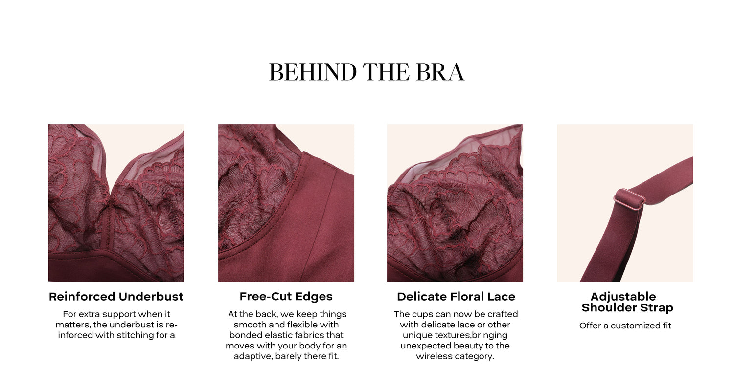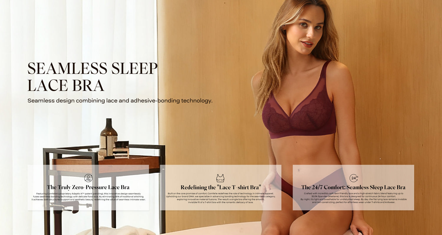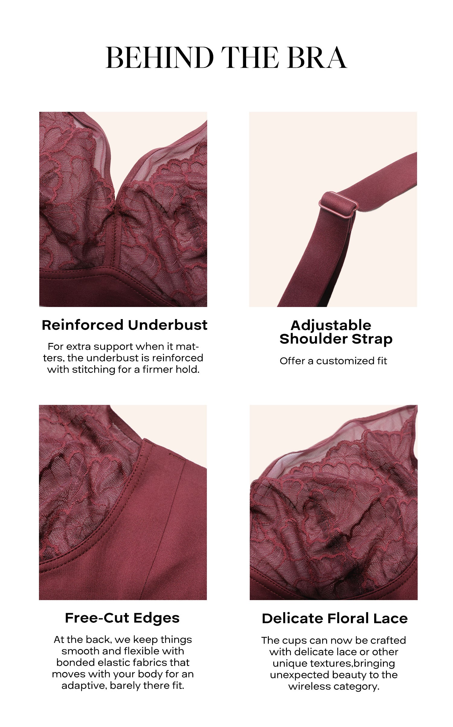 Featuring Comfelie’s proprietary Adaptiv-X™ patent (pending), this innovative design seamlessly fuses seamless bonding technology with delicate floral lace. The inner layer features extended elastic mesh panels reaching up to the shoulder area, creating dynamic stability that moves with you.