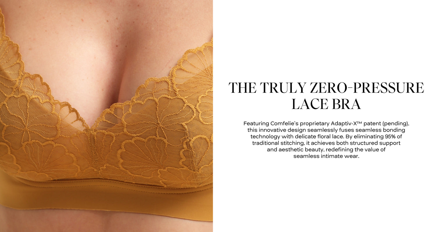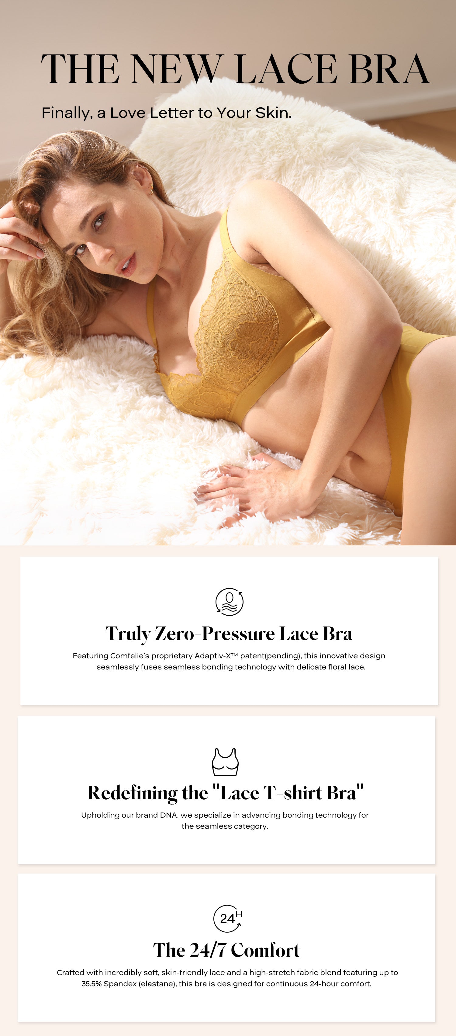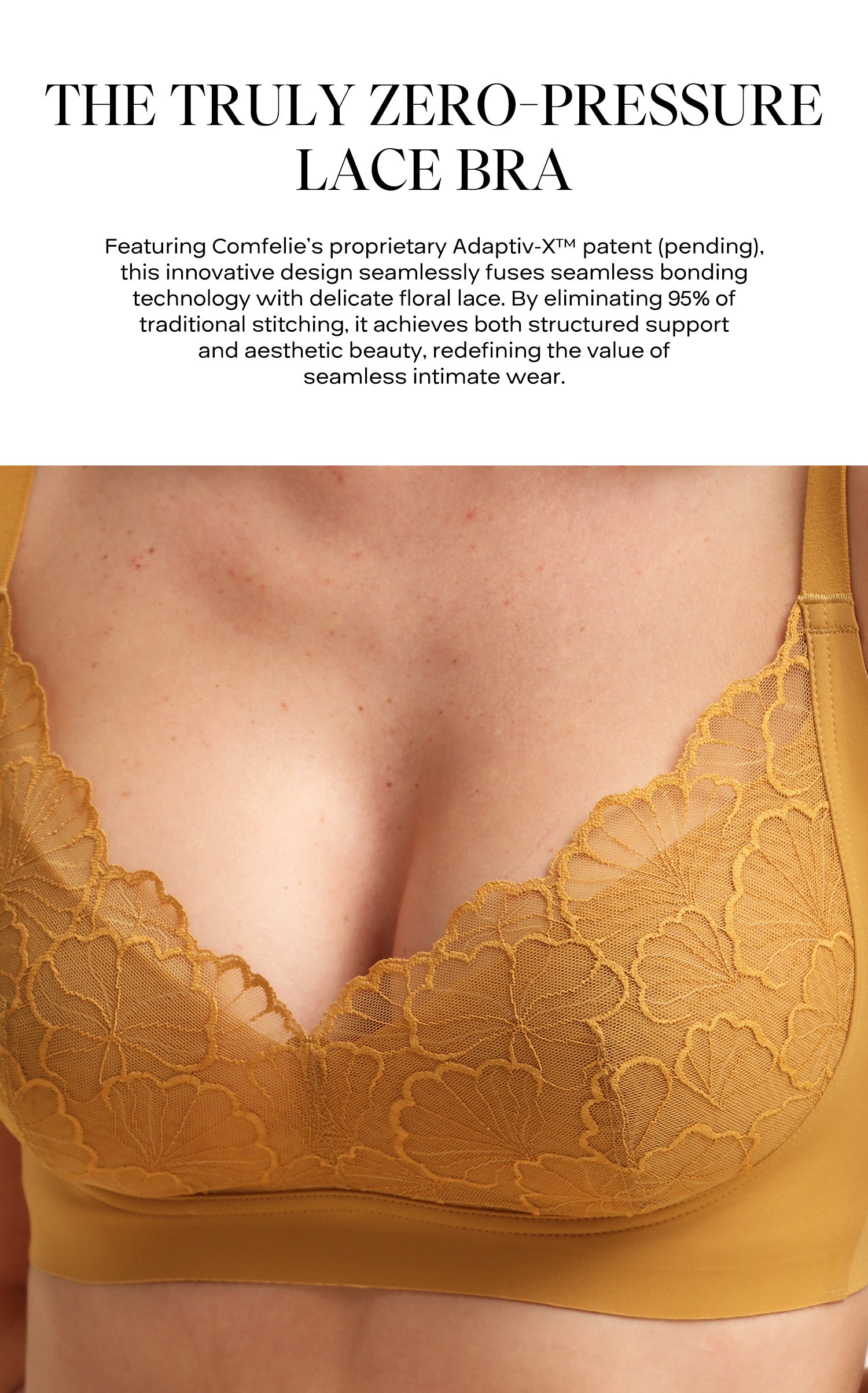 Featuring Comfelie’s proprietary Adaptiv-X™ patent (pending), this innovative design seamlessly fuses seamless bonding technology with delicate floral lace. Crafted with incredibly soft, skin-friendly lace and a high-stretch fabric blend featuring up to 35.5% Spandex (elastane), this bra is designed for continuous 24-hour comfort.