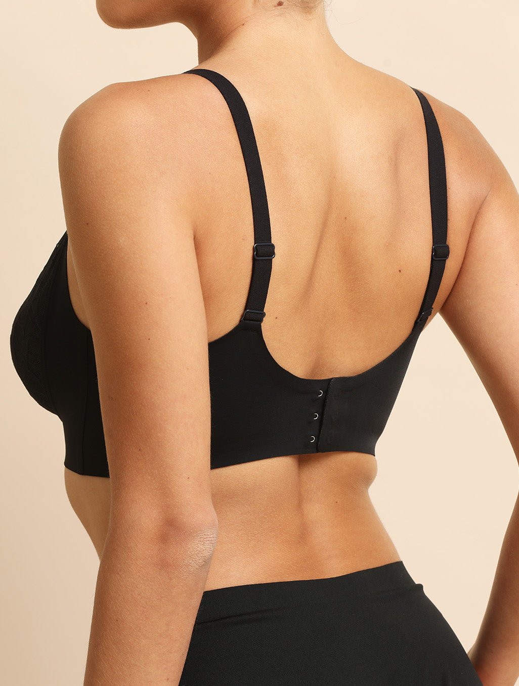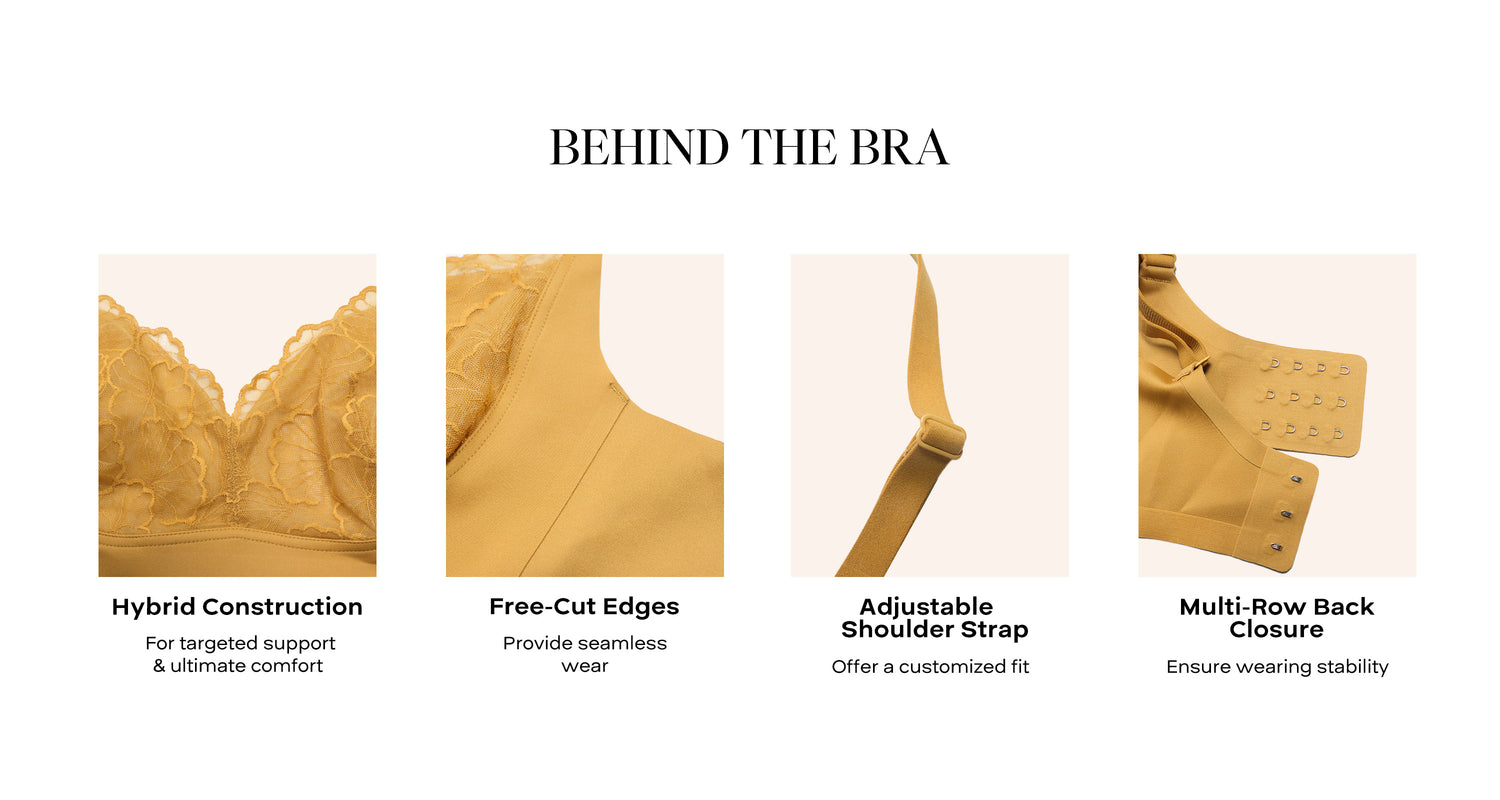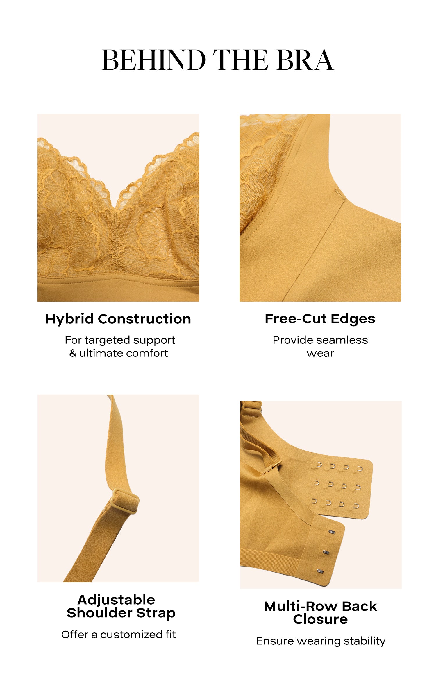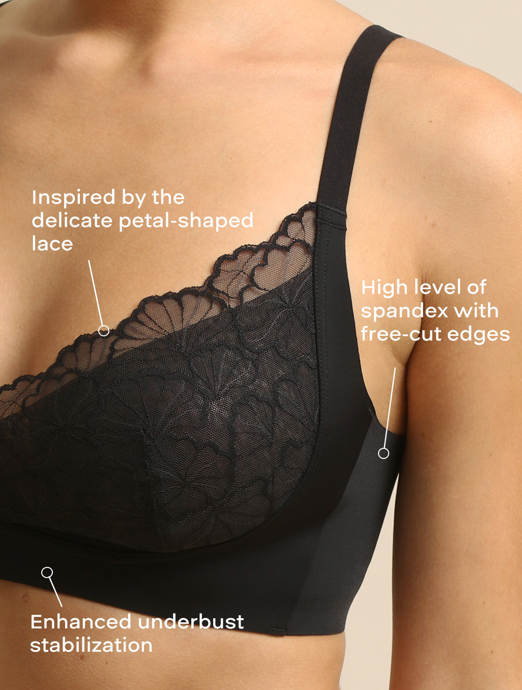 Featuring Comfelie’s proprietary Adaptiv-X™ patent (pending), this innovative design seamlessly fuses seamless bonding technology with delicate floral lace. Crafted with incredibly soft, skin-friendly lace and a high-stretch fabric blend featuring up to 35.5% Spandex (elastane), this bra is designed for continuous 24-hour comfort.